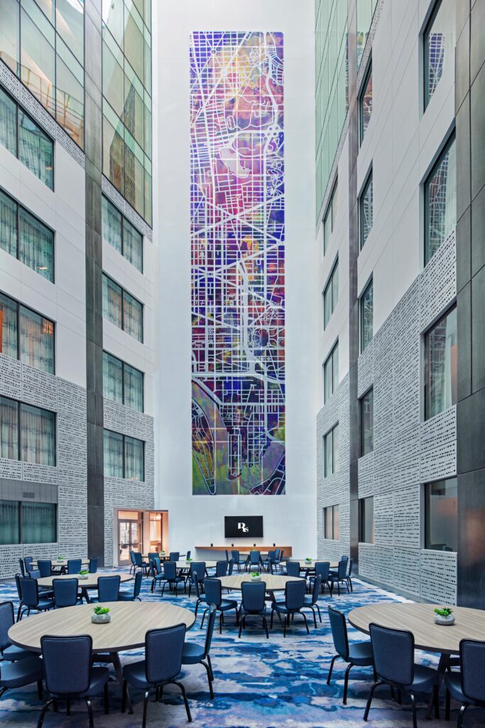 Adaptive reuse and restoration projects always bring complexity, Sonesta’s Atkeson said. But the redevelopment of the Royal Sonesta Capitol Hill required particularly careful coordination. The original building was concrete framed with deep floorplates and a wedge-shaped footprint, which became the primary drivers of its design.